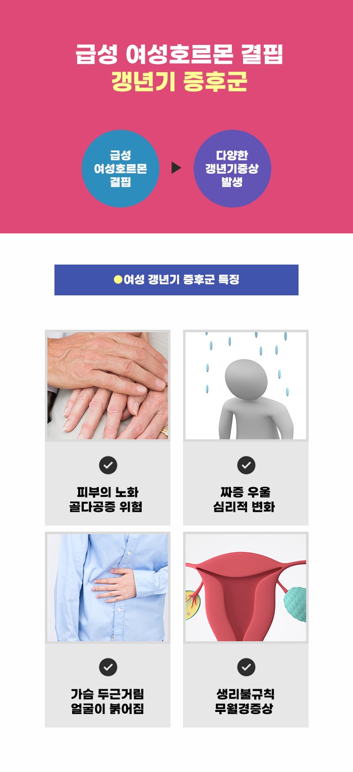 급성 여성호르몬 결핍으로 인해 생기는 증상을 알아보자면 가슴이 두근거리는 증상이나 얼굴이 붉어지는 증상이 있다고 합니다. 덥고 얼굴이 뜨겁고 붉은 증상 외에도, 땀이 많이 나는 증상 등이 생기기도 합니다. 이런 증상이 밤에 더 심해지는 경우가 많아 갱년기에 잠을 못 이루고 수면의 질이 크게 떨어지는 분도 있습니다. 그리고 짜증, 우울감 등의 문제, 건망증이 심해지는 문제 등을 겪는 분도 있습니다.