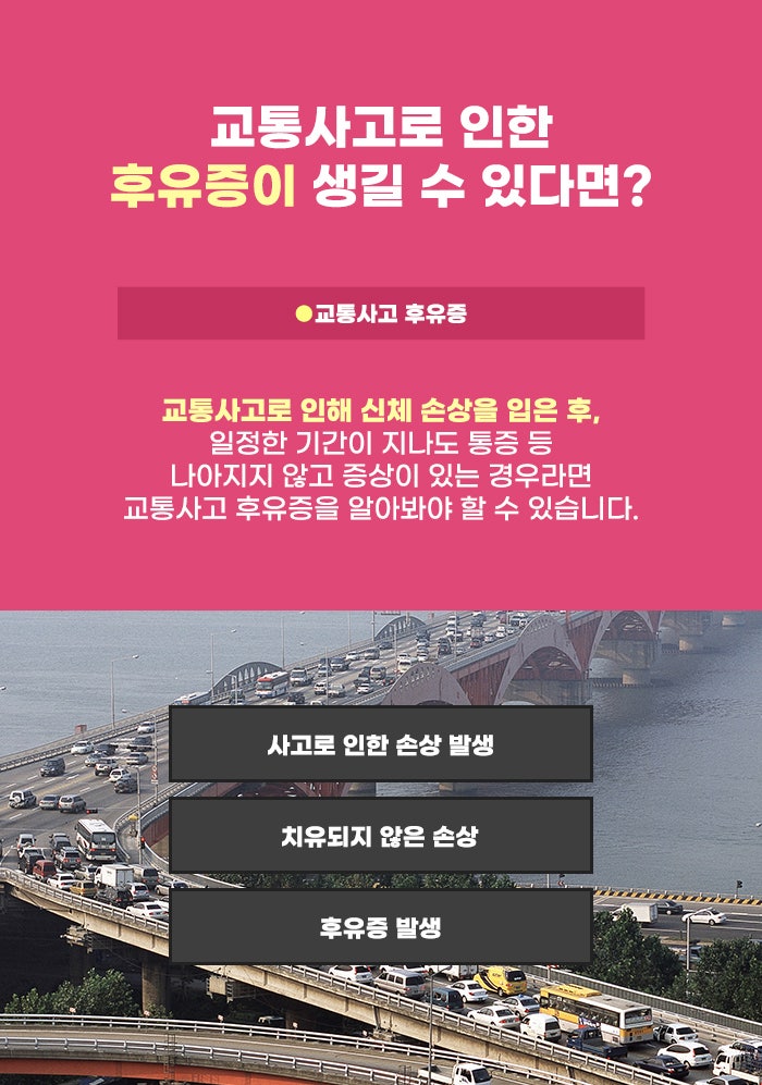 그런데 큰 사고가 아니라면 다행이라는 생각이 들겠지만, 별다른 골절이나 보이는 부상도 없고 당장 느껴지는 통증이 없다고 해서 무조건 진주교통사고병원추천 정보 필요하지 않은 상황이라고 단정 지을 수는 없습니다. 개인에 따라서 보이지 않는 손상, 인대나 근육, 근막 등의 부상, 근육의 과도한 긴장과 스트레스 등이 남을 수도 있는데요. 적절한 조처를 하지 않을 경우 만성 통증 등의 후유증이 남을 가능성도 있다고 합니다.