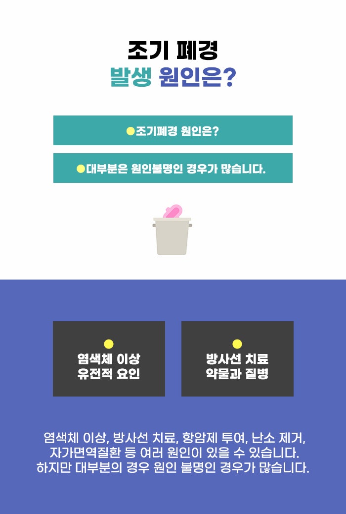 조기폐경은 왜 생길까요? 조기폐경 증상이 생기는 이유는 다양할 수 있습니다. 염색체 이상으로 인해 폐경을 빠르게 겪기도 합니다. 그리고 항암으로 인해 폐경을 겪기도 하는데요. 방사선 치료나 항암제 투여 등이 영향을 줄 수 있다고 합니다. 난소 제거 수술을 하는 경우나 자가 면역질환을 겪는 경우 등 여러 요인이 영향을 줄 가능성이 있습니다.