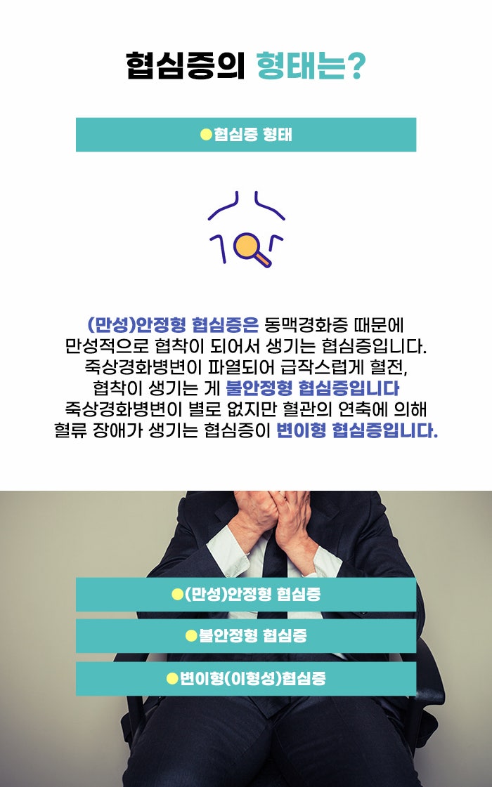 관상동맥의 문제로 인해 심장의 근육이 이차적으로 허혈 상태에 빠지게 되는데요. 이런 상태를 두고 협심증이라고 합니다. 협심증에는 안정형 협심증, 불안정형 협심증, 변이형성 협심증이 있다고 합니다. 동맥경화증으로 인해 만성적으로 관상동맥 협착이 생긴 경우에는 안정형(만성) 협심증이라고 부릅니다.