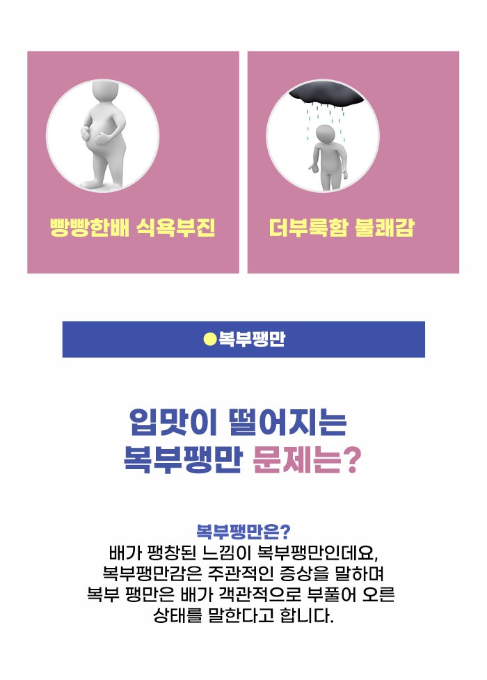 배가 빵빵하고 복부팽만 증상이 있을 경우에도 진주소아식욕부진 고민할 수 있겠습니다. 배가 부풀어 오르는 것, 실제로 허리 둘레가 늘어난 상태가 되는 게 복부팽만인데요. 실제로 복위가 증가하지 않았지만 더부룩하고 불편한 느낌을 받는 경우 복부팽만감이라고 합니다. 소화불량 증상으로 인해서 복부팽만이 나타나기도 하는데요.