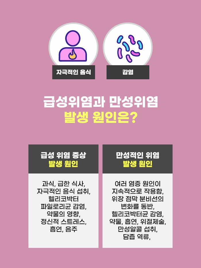 만성 위염 그리고 급성 위염으로 나눌 수 있는데요. 위염이 오래 이어지는 만성 위염은 급성 위염과 위장 점막에 파고드는 염증 세포의 종류가 다를 수 있다고 합니다. 그리고 급성 위염 발생 원인이 오래 이어지면서 만성 위염 상태가 될 수도 있다고 합니다. 헬리코박터균 감염 등의 특정 균의 감염, 혹은 아스피린이나 소염제 등의 약물 섭취도 위염, 소화불량에 영향을 줄 수 있다고 합니다.