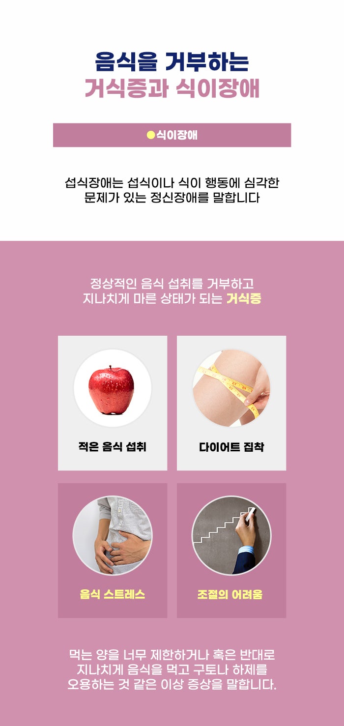 어린이들도 다이어트에 집착하고 몸무게에 대해 너무 신경을 쓰면서 식욕부진, 식이장애 문제를 보이는 경우도 있습니다. 또한 다이어트에 대한 열망만이 아니라 여러 스트레스 요소로 인해 정상적인 음식 섭취가 어려운 식욕부진, 식이장애를 겪을 수도 있다고 하니 참고하셨으면 합니다.