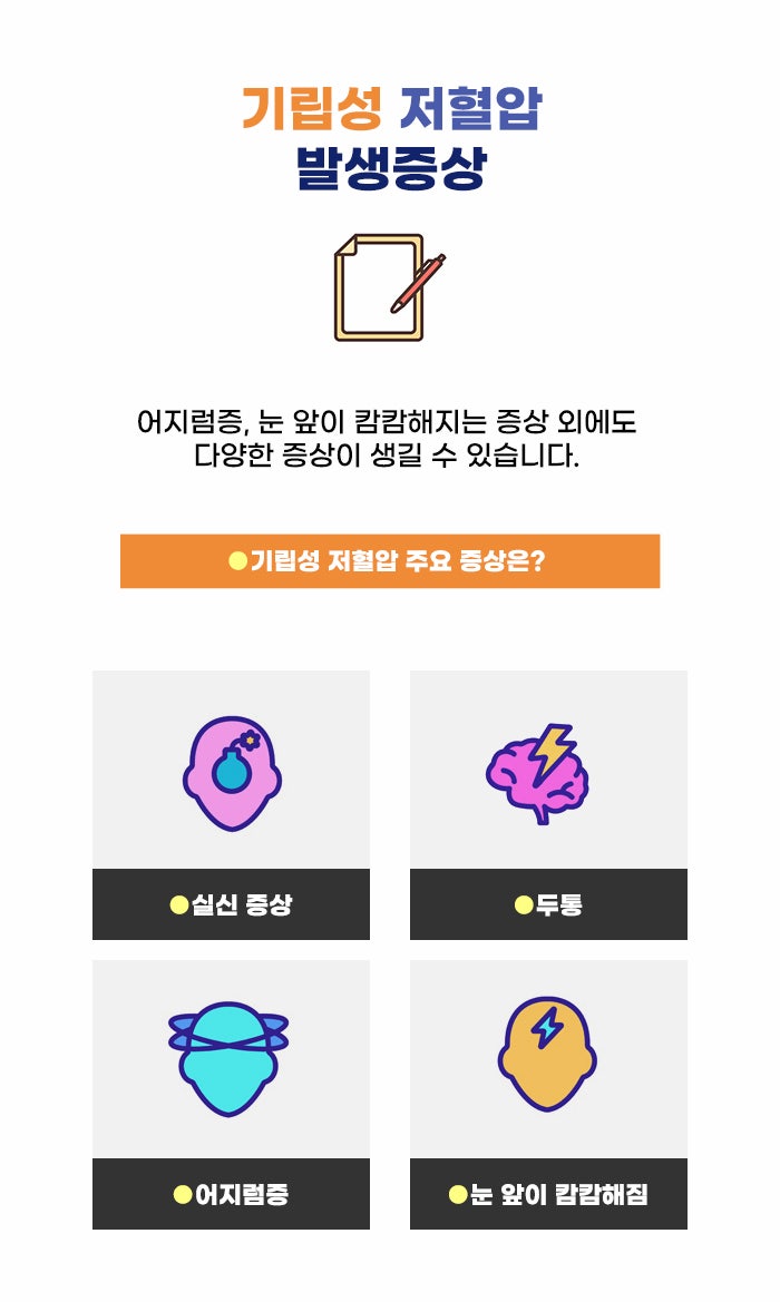 심장박동수가 늘어나고 말초혈관의 저항을 증가시키는데요. 이런 과정을 통해 급격한 혈압 하강을 막게 된다고 합니다. 정상 상태에서는 누운 상태에서 갑자기 일어날 경우 맥박이 분당 10-25회 정도 늘어나고 수축기/이완기 혈압이 약 5-10mmHg 감소하면서 대처하게 된다고 합니다. 그런데 기립성 저혈압 문제를 겪는 분의 경우 이런 정상적인 몸의 대처보다 더 큰 폭으로 혈압 하강이 일어나며 진주기립성저혈압 빈혈 정보 고민할 만한 어지럼증이 생길 수 있습니다.