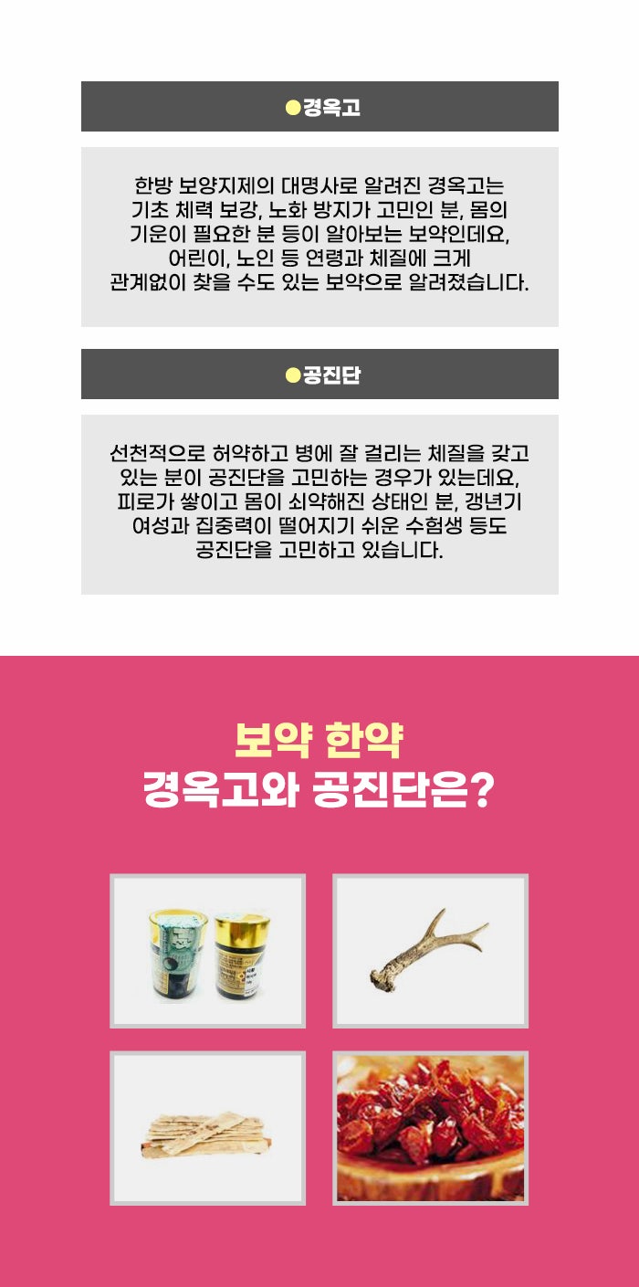 그렇기에 무조건 남들이 좋다고 해서 따라 하는 게 아니라, 나의 상황, 고민 그리고 나의 특성에 맞는 것인지 확인해야 하겠습니다. 현재 진주시한의원한약추천 정보 알아보는 분의 문제나 체질적 특징은 개인마다 다를 수 있는데요. 그렇기에 한약 정보나 보약 정보를 찾고 있다면 이런 점을 고려해서 꼼꼼히 따져봐야 하겠습니다. 또한 공진단, 경옥고 등에 대해 궁금해하는 경우도 있는데요. 좋은 약재를 사용했는지 확인하는 것도 필요하겠습니다.