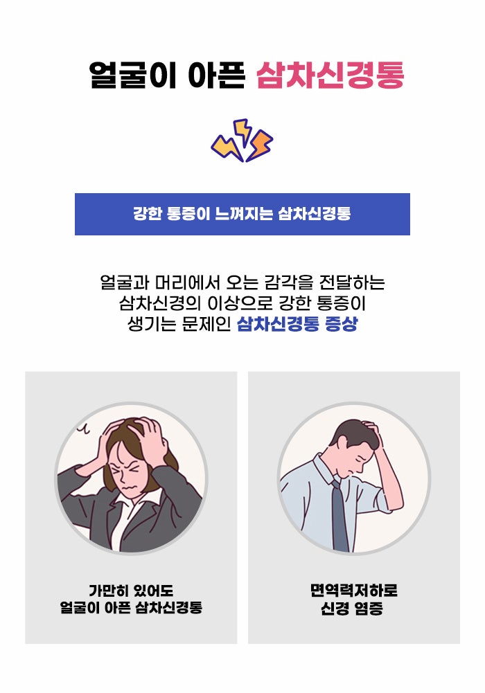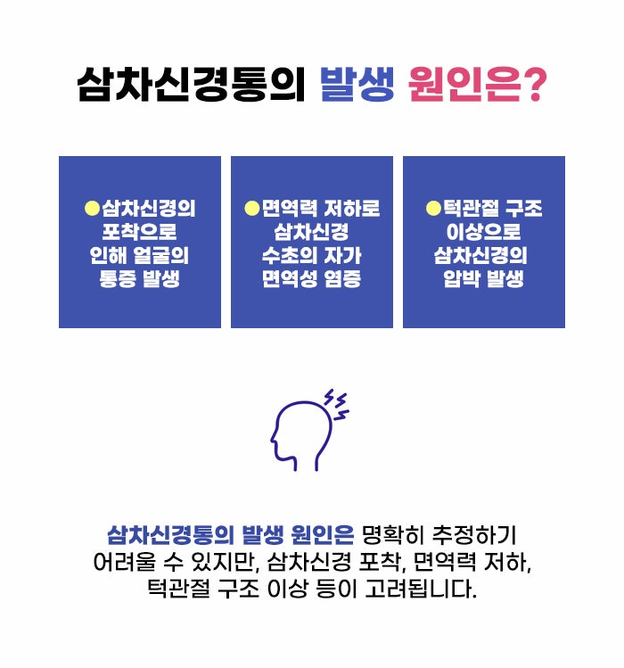 그런데 원인을 알 수 있는 경우에는 원인에 따라서 대처할 수도 있지만, 원인이 명확하지 않은 삼차신경통의 경우에는 더욱 고민이 될 수 있는데요. 제5뇌신경의 삼차신경영역인 상악신경, 하악신경, 안신경 등의 신경통으로, 원인이 명확하지 않은 특발성 삼차신경통을 겪고 있다면 더욱 통증에 대처하기 힘들 수 있습니다. 면역력 저하로 인한 신경의 염증, 턱관절 장애로 인한 삼차신경 압박, 삼차신경 포착 등이 고려될 수도 있다고 합니다.