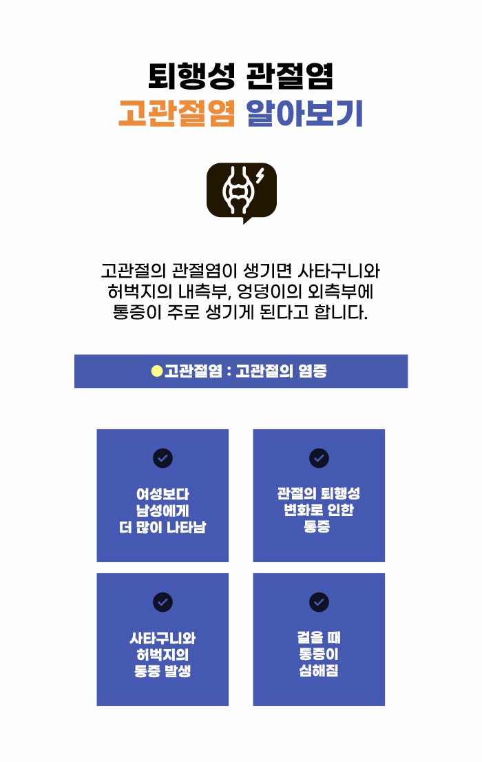 이렇게 연골이 약해지고 소실되며, 관절 사용 시 뼈가 부딪히고 통증이 생기기도 합니다. 이런 상태가 되는 것이 퇴행성 관절염이라고 합니다. 퇴행성 관절염은 신체의 여러 부위 관절에 발생할 수 있는데요. 특히 고관절염의 경우 남성에게 더 많이 발생하며 발생하는 연령대는 중년 이후가 많다고 합니다. 사타구니와 허벅지 부분의 통증이 생겨 진주고관절통증 고민할 수 있는데요. 걸을 때 통증이 더 심해질 수도 있다고 합니다.