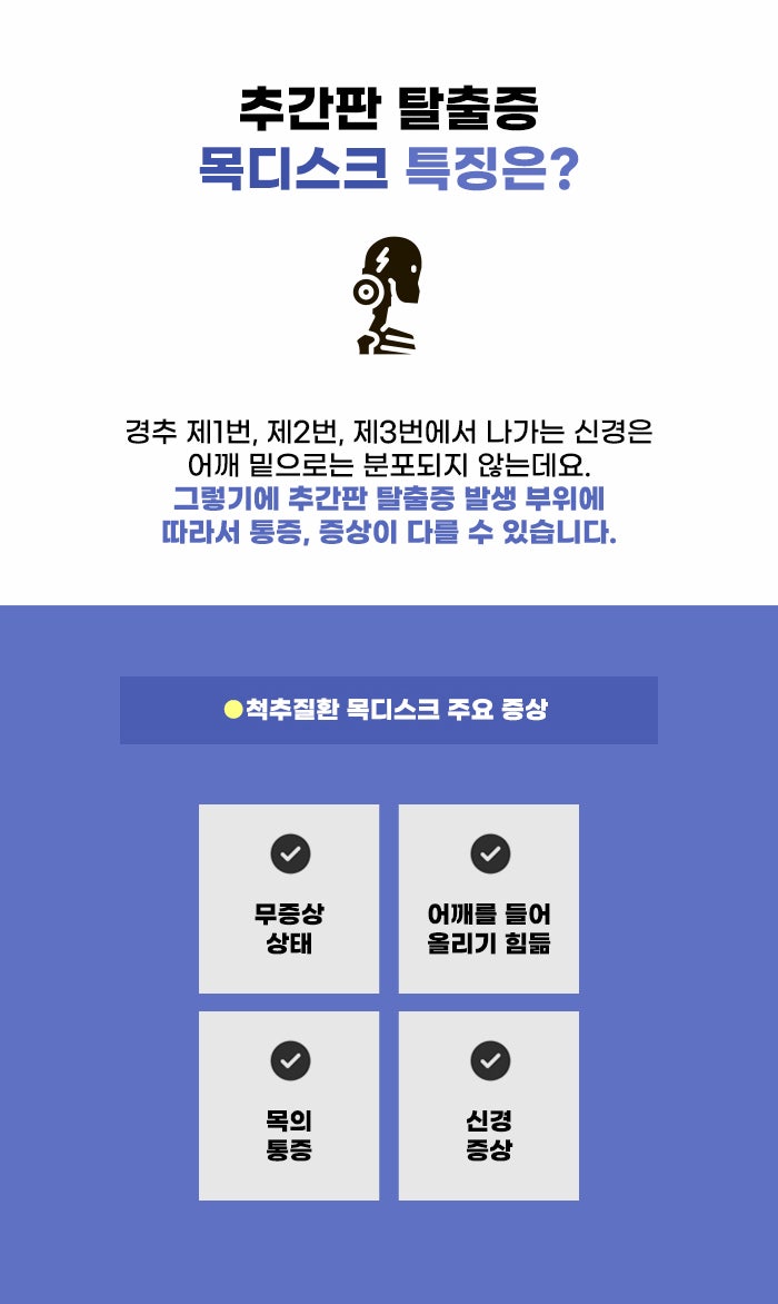추간판 탈출증이 경추의 4번, 5번, 6번, 7번 사이에서 많이 생기지만 다른 부위에도 생길 수 있습니다. 경추의 1번과 2번 사이, 2번과 3번 사이, 3번과 4번 사이에 생길 경우 신경이 어깨 밑으로 분포되지 않는데요. 그렇기에 손과 팔의 저림, 방사통 같은 전형적인 목디스크 증상은 생기지 않을 수도 있습니다. 대신 가슴이 답답한 증상, 두통이나 현기증 같은 증상이 생길 수도 있다고 합니다.