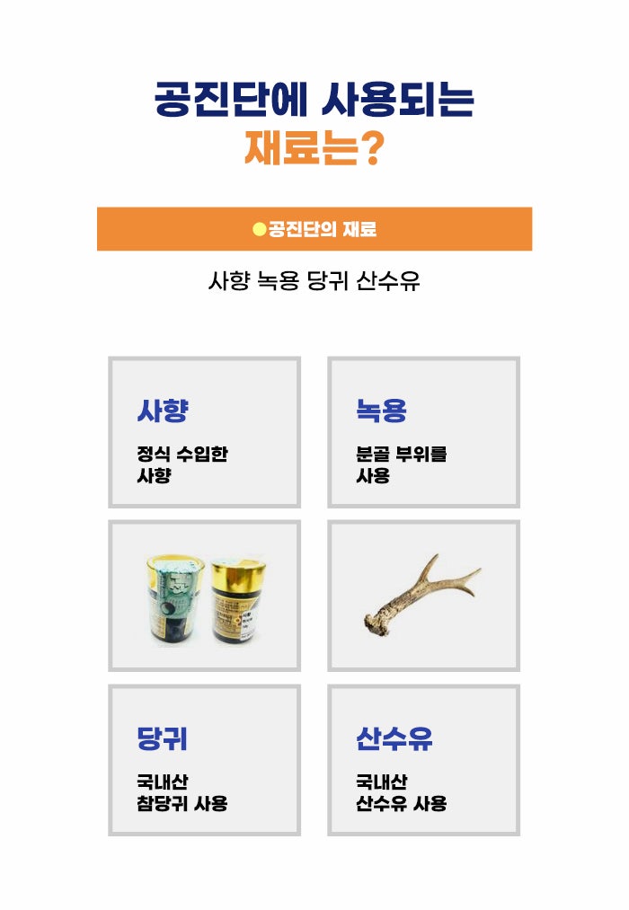 동의보감에서 공진단에 대해서 쓴 것을 알아보자면 선천적인 원기가 약한 경우 찾는 보약이라고 적혀 있다고 합니다. 현대에서는 원기가 약한 분, 면역력이 약한 게 고민인 분, 진행되는 노화가 고민인 분 등이 찾는 보약인 것 같은데요. 공진단에는 어떤 약재가 사용되는지 궁금할 수 있습니다. 공진단의 성분을 알아보자면 공진단은 사향, 녹용, 당귀, 산수유 등의 약재가 쓰인다고 합니다.