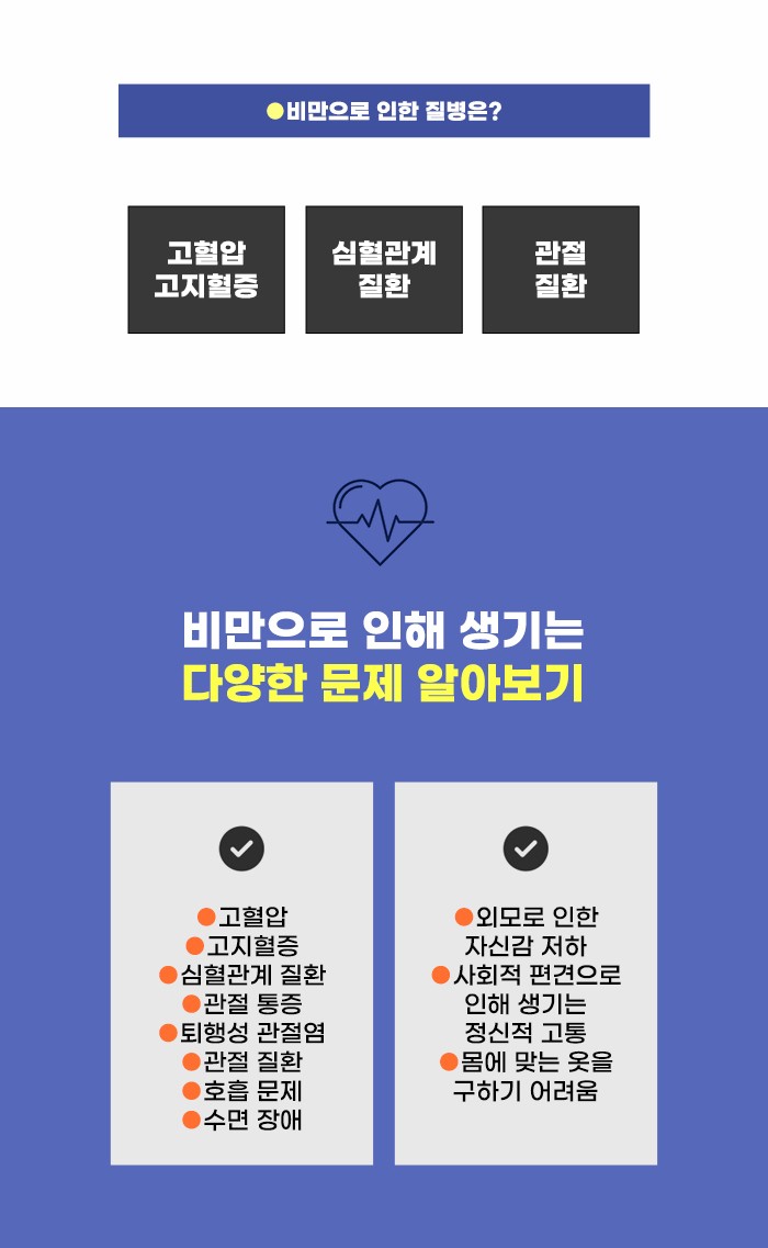 비만 상태가 되면서 고지혈증이나 당뇨, 고혈압 같은 성인병의 위험이 커지게 되는데요, 수면 장애와 호흡 문제가 생기는 경우도 있다고 합니다. 또한 몸무게를 전체적으로 받게 되는 부분인 발바닥, 그리고 관절 부분인 발목이나 무릎 등에 통증이 생기게 되기도 합니다.