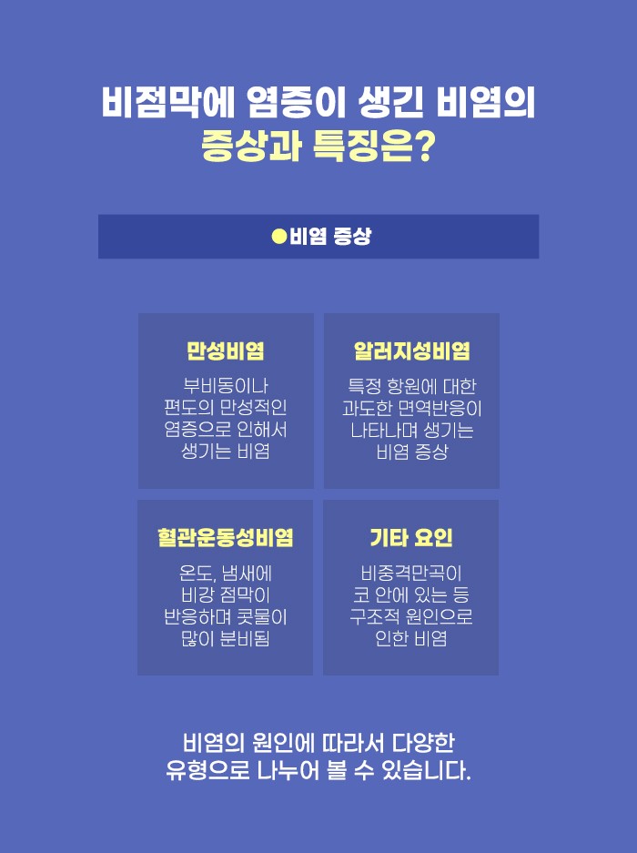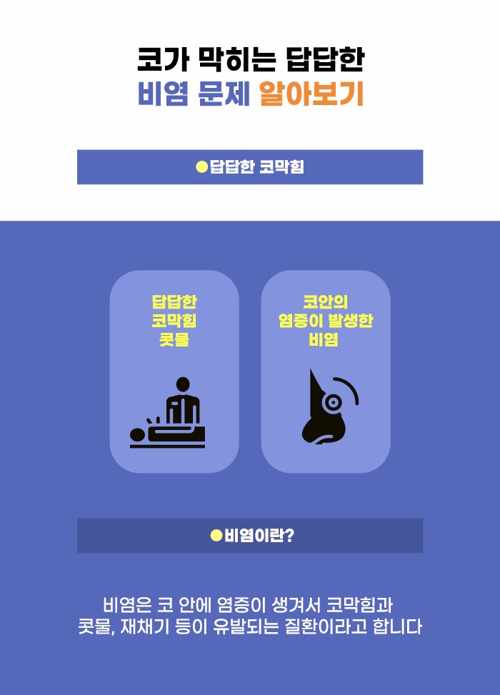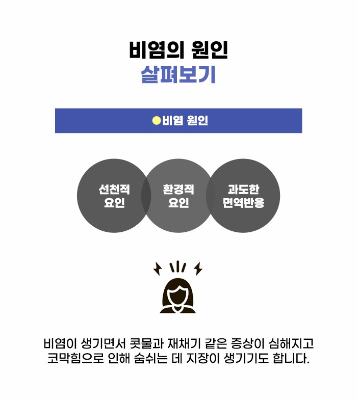 비염은 코안에 염증이 생긴 상태라고 하는데요, 비강 내 염증이 발생한 비염은 크게 만성비염, 알레르기 비염 등으로 나누어 볼 수 있다고 합니다. 비염이 있을 경우 콧물이 흐르거나, 코막힘이 생기게 되고, 코로 숨을 쉬기 어렵다 보니 개구 호흡하게 되거나 집중력이 떨어지는 것 같은 문제가 생기기도 합니다. 알레르기 비염과 만성 비염의 분류는 명확하지 않은데요.