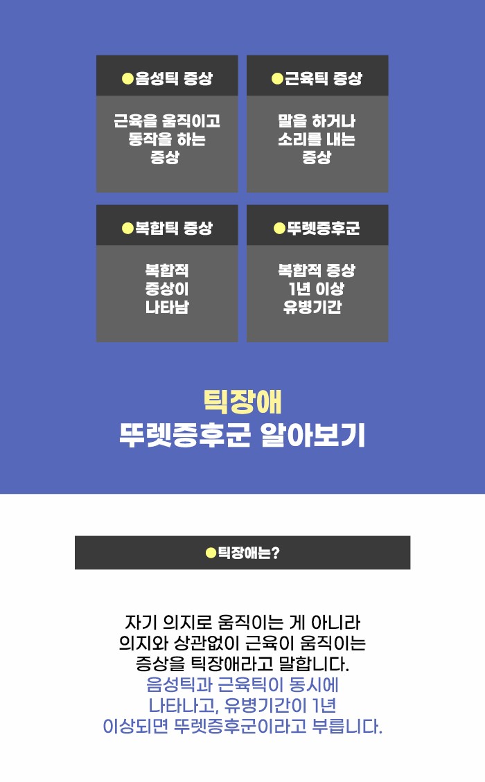 틱장애는 주로 학령기 아동에게 나타난다고 하는데요, 소리를 내는 경우 음성틱, 몸을 움직이는 경우 근육틱이라고 합니다. 복합적으로 증상이 나타나는 경우 복합틱이라고도 부르고 있습니다. 틱장애의 분류는 조금씩 다를 수도 있는데요, 시간이 지나며 복합적인 증상이 나타나고 1년 이상 유병 기간이 있을 경우 뚜렛증후군으로 볼 수도 있습니다.