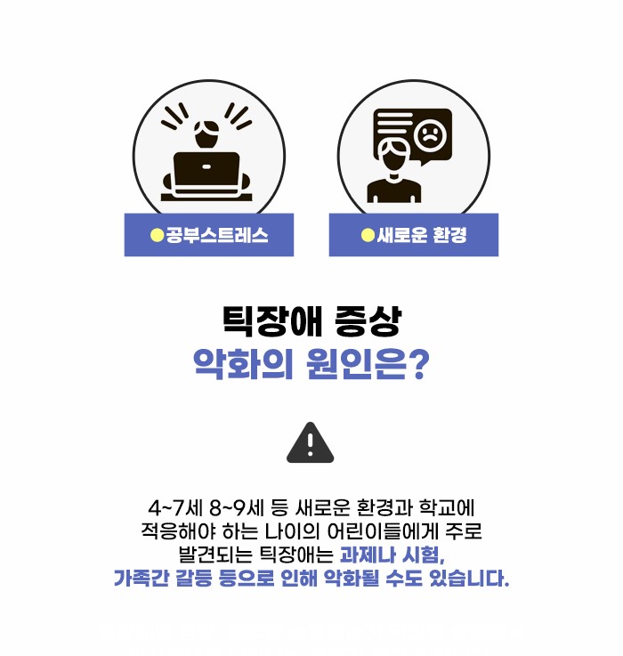 이런 이유로 인해 아이들의 건강과 성장도 위협받을 수 있다고 합니다. 특히 아이들에게 나타나는 문제 중 하나로, 스트레스와 밀접한 관련이 있는 문제로 틱장애가 있다고 합니다. 틱장애는 자신의 의시와 상관없이 몸을 움직이거나 말소리를 내는 증상, 신체의 일부를 빠르게 움직이는 증상이 특징이라고 합니다.