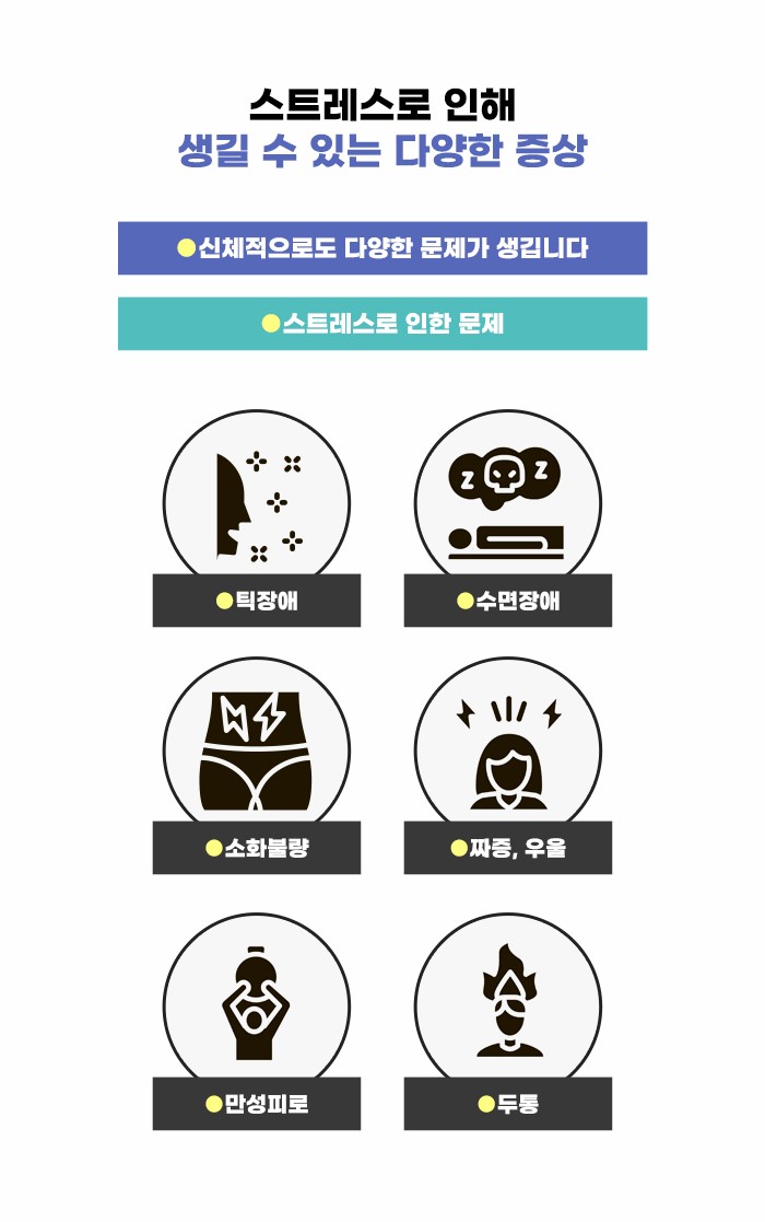 그리고 몸에 통증이나 다른 질병 등 건강상의 문제가 생기면서 스트레스를 더 받게 되고, 이 때문에 더 몸의 이상이 진행되는 악순환이 반복될 수도 있는데요. 그렇기에 현재 바쁜 생활 속 스트레스로 인해 지치고 정신적 피로가 더해지고 있다면, 되도록 충분히 휴식할 수 있는 시간을 갖고, 건강한 방식으로 스트레스를 풀기 위해 힘쓰는 것도 중요하다고 합니다.