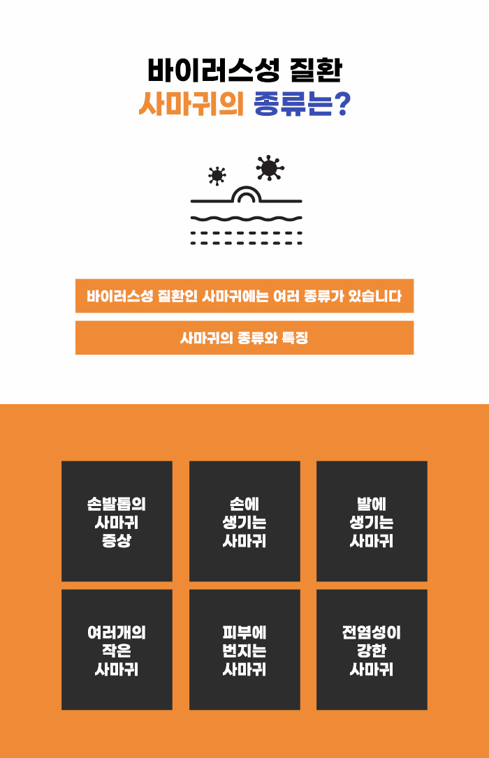그리고 사마귀와 비슷한 특징을 갖고 있는 질환으로 대상포진이 있는데요, 몸에 잠복해 있던 수두-대상포진 바이러스가 활성화되면서 수포가 생기는 질환이라고 합니다. 단순히 피부에 나타나는 수포만 문제가 되는 게 아니라 바이러스성 질환이라는 특징이 있는데요.