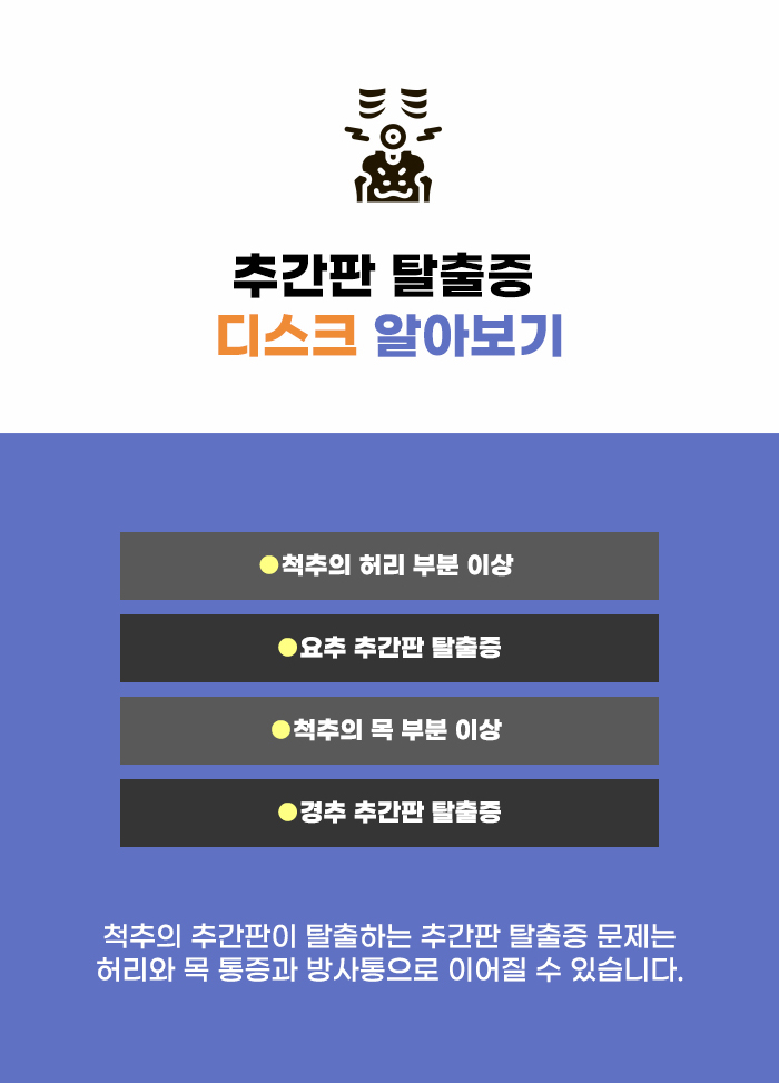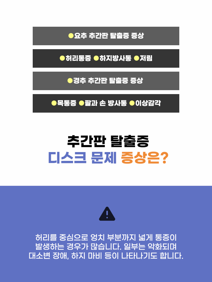 추간판이 찢어지고 안에 있어야 하는 수핵이 자리를 이탈하게 될 수 있는데요, 이렇게 탈출한 수핵이 주변의 신경근을 자극하기도 하고, 염증과 통증이 생기기도 합니다. 추간판 탈출증이 발생할 경우 문제가 생긴 부위에 따라서 통증이 생기기도 하고, 피로감이나 뻐근함 정도의 증상이 생기기도 합니다. 그리고 증상이 악화되면서 대소변 장애, 하지 마비 등의 위험성이 존재할 수도 있다고 합니다.
