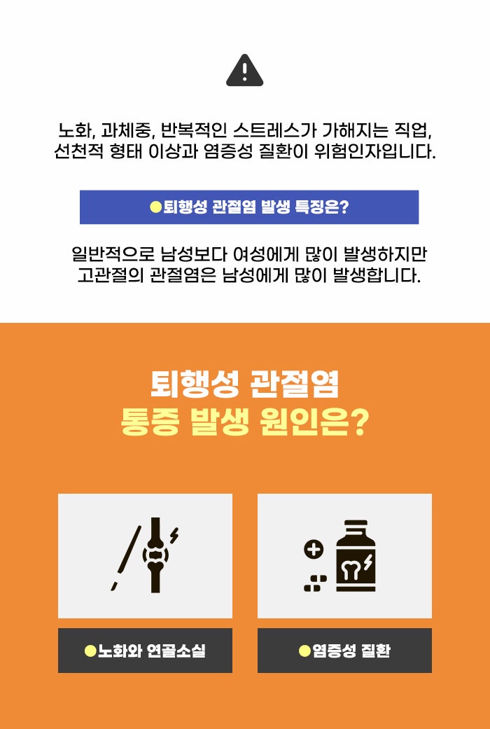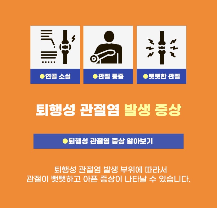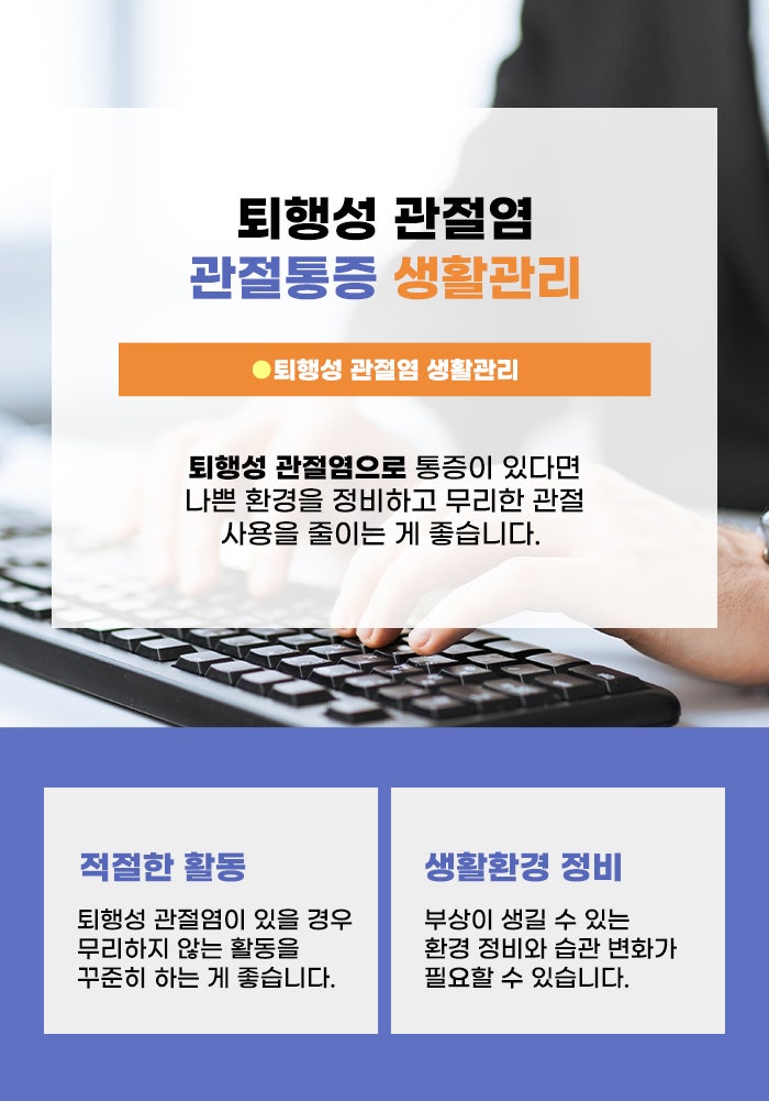 퇴행성 관절염은 퇴행성 질환이다 보니 노화가 진행되고 오랜 시간 관절을 사용해 왔던 고령층에게 많이 발견됩니다. 하지만 관절 사용을 자주 해온 분에게도 이르게 발견되기도 합니다. 그렇기에 평소 연골의 중요성에 대해서 알고 무리한 활동을 자제하는 게 좋다고 합니다. 그리고 무조건 통증 부위를 쉬고 운동을 아예 하지 않을 경우, 근력 약화를 불러오고 근육의 부담을 키울 수도 있습니다. 그렇기에 무조건 쉬는 게 아니라 크게 무리를 하지 않는 선에서 꾸준히 활동하는 게 중요할 수 있다고 합니다.