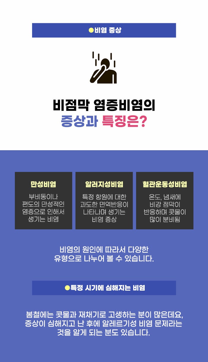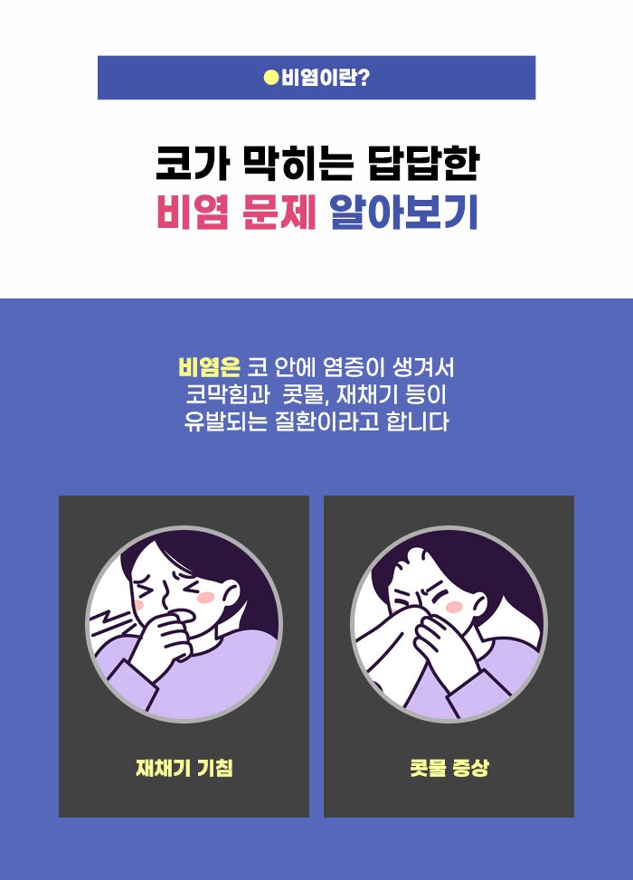 그리고 비염이 반복되고 자극을 주면서 여러 합병증의 위험도 커질 수 있습니다. 코 뒤로 콧물이 넘어가며 불쾌감, 구역감 등을 주는 게 후비루 문제인데요, 그리고 머리 안의 빈 공간인 부비동에 염증, 농이 생기는 것을 부비동염이라고 합니다. 이런 증상도 비염 증상의 악화로 인해 생길 수도 있다고 하는데요. 염증이 진행되면서 더 큰 고민이 될 수도 있는 만큼 비염이 의심된다면 꼼꼼히 문제를 알아보시고 건강한 생활을 꾸준히 지킬 수 있으면 좋겠습니다.
