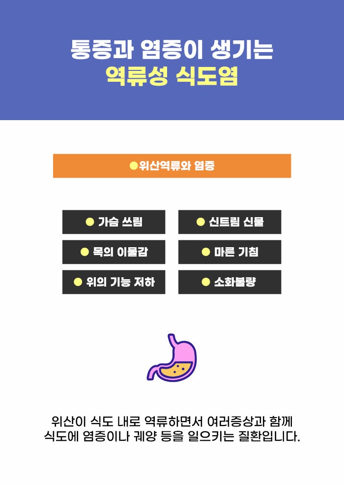 야식을 좋아하고 식사 후 바로 잠드는 분, 식후에 바로 눕는 분의 경우 더욱 위장장애에 대해 주의해야 하는데요. 이런 습관은 위 안의 내용물이 역류하는 식도 역류, 그리고 염증이 생기는 역류성 식도염 문제를 불러올 수도 있기 때문입니다. 위의 내용물이 식도로 올라오면서 통증, 염증이 발생하는 질환이 역류성 식도염이라고 하는데요.