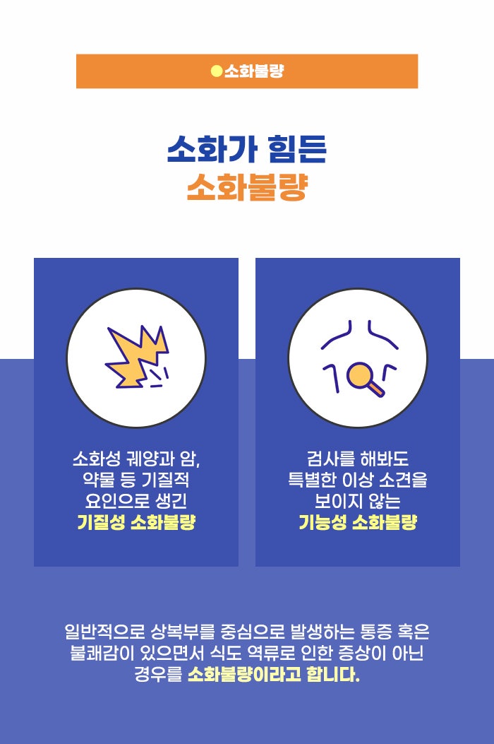 소화불량은 기질성 소화불량, 기능성 소화불량으로 나뉘는데요, 암, 종양, 약물 등 특정 원인이 명확한 상태에서 소화불량이 나타나는 게 기질성 소화불량이라고 합니다. 그리고 특별한 이상 소견이 드러나지 않는 상태에서 소화불량이 반복되는 경우 기능성 소화불량 문제로 보기도 합니다.