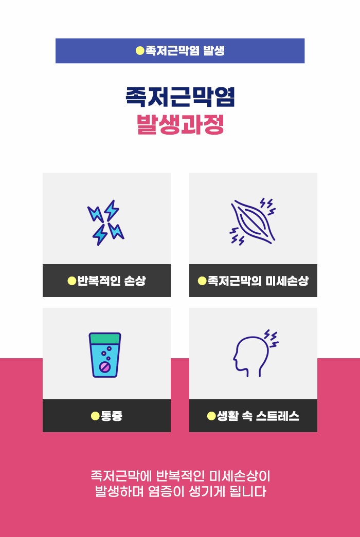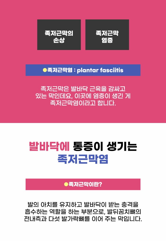 평소와 비슷하게 운동을 했는데 컨디션이 좋지 않은 상태이다 보니 부상을 입는 경우도 있다고 합니다. 그렇기에 꾸준히 운동을 하는 분이라면, 건강하기 위해서 했던 운동이 내 몸을 해치는 결과가 되지 않도록 안전한 방식으로 운동을 하기 위해 힘쓰셨으면 하는데요. 무리한 운동으로 인해 생기는 미세 손상으로 통증이 생기는 질환이 있습니다. 바로 족저근막염입니다.