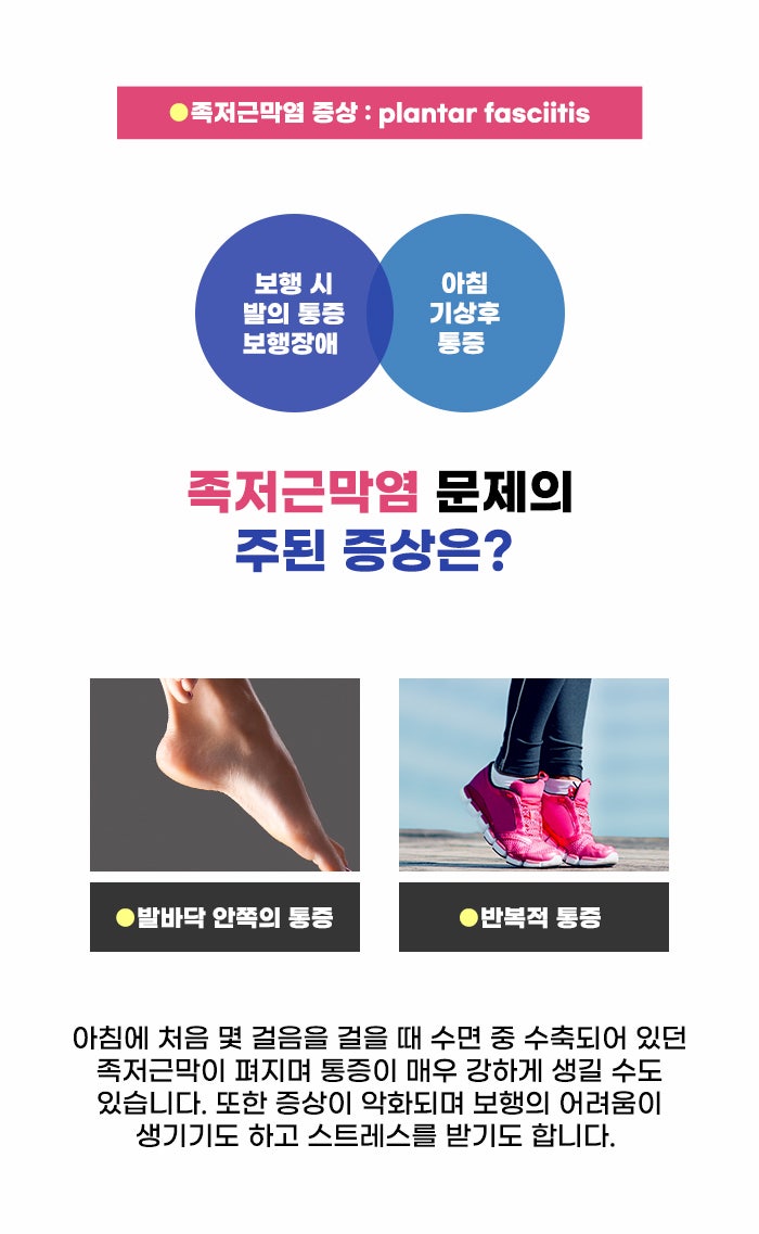 발뒤꿈치에서 시작되어 발가락이 시작되는 부분에 붙어있는 이 족저근막에 미세한 손상이 반복되는 게 족저근막염의 원인이라고 하는데요, 족저근막염이 생길 경우 특징적인 증상은 아침에 기상 후 처음 몇 발짝을 걸을 때 매우 심한 통증이 느껴지는 것이라고 합니다.