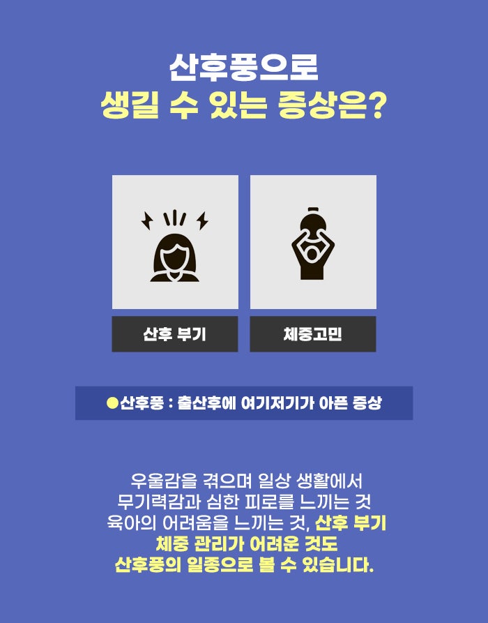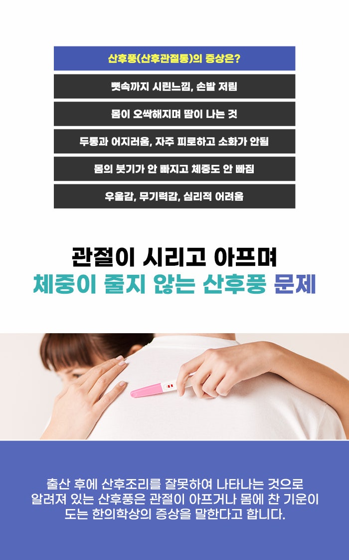 바람이 든 듯이 관절이 시리고 아프다고 해서 산후 관절 통증을 두고 산후풍이라고 부르는데요. 이 밖에도 소화불량, 심각한 피로, 무기력감, 두통 증상, 체온 조절이 어려운 증상, 손발이 시리거나 저린 증상 등 여러 이상 증상을 두고 산후풍이라고 부릅니다. 출산 후 산후풍 조짐이 있거나, 임신, 출산 과정에서 무리한 분의 경우 더욱 진주 사천 산후조리 과정이 중요할 수도 있다고 합니다.