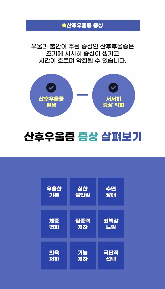 출산 후 산욕기는 4주에서 6주 사이 기간을 말하는데요. 이 동안 불면증이나 과도한 체중 변화를 경험하고, 우울한 기분이나 심한 불안감을 느끼는 경우 산후 우울증에 대해서 생각해 봐야 할 수도 있습니다. 집중력이 떨어지거나 의욕이 떨어지는 경험을 하기도 하고, 자기 자신에 대해서 가치가 없다고 생각하는 경우도 있습니다.