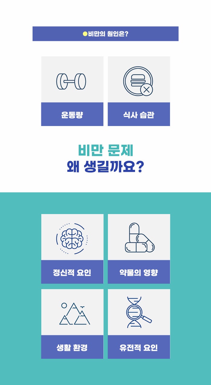 비만에 대해서 '개인의 의지', '게으름', '음식에 대한 집착' 문제로만 생각하는 경우도 있습니다. 비만은 먹은 에너지와 소비하는 에너지의 불균형이 오랜 시간 이어져 온 결과입니다. 그렇기에 비만을 개인의 문제라고 생각하기도 하는데요. 하지만 실제로 비만은 환경, 가족력, 유전적 요인과 체질, 스트레스, 질병 등 여러 요소가 복합적으로 영향을 미친 결과일 수 있습니다. 개인의 의지만 탓하는 게 아니라 비만의 원인을 파악하고 벗어나는 게 다이어트에서 중요합니다.