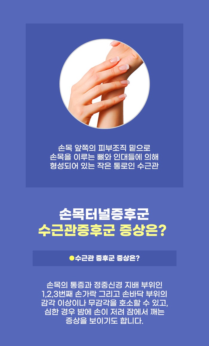 수근관이 좁아지면서 손목이 아프고 손가락이 저린 질환을 두고 수근관증후군, 혹은 손목터널증후군이라고 부릅니다. 엄지와 둘째, 셋째 손가락이 저리고 무감각해지는 증상이 가장 흔한 편이라고 하는데요, 엄지 두덩 부분이 뻐근한 통증이 생기기도 하고 팔과 어깨 통증이 생겨 고민하는 분도 있다고 합니다. 또한 야간에 이런 통증이 더 심해지는 분도 있습니다.