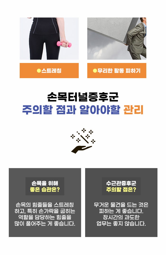그리고 먼저 언급했듯이 요즘 많아지는 컴퓨터, 스마트폰 사용 시간으로 인해 손목과 손가락 통증에 시달리는 분도 적지 않다고 하는데요. 이 밖에도 류마티스 관절염이나 통풍 및 기타 감염 등, 활액막염을 초래하는 질환에 걸리면서 합병증으로 인해 손목 통증을 겪는 분도 있다고 합니다. 수근관증후군이 염려되는 분이라면 다양한 문제를 확인하고 꾸준한 스트레칭, 생활 관리를 하시는 게 좋겠습니다.