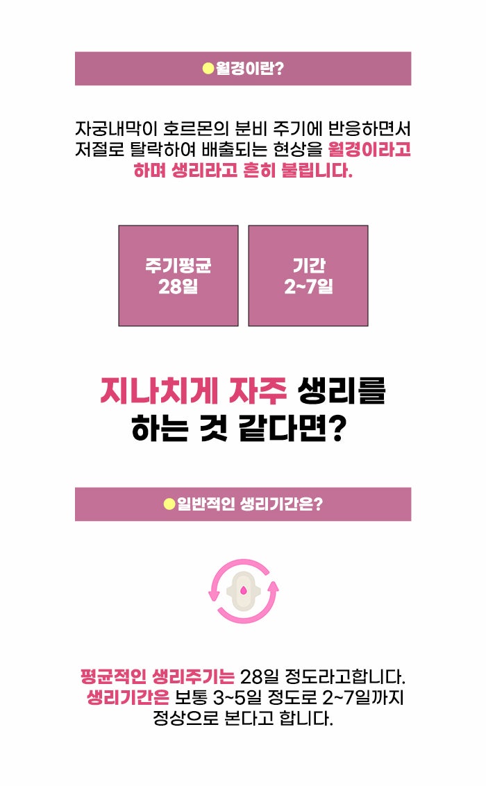 여성의 월경은 가임 능력과 밀접한 연관이 있는 만큼, 월경과 관련해 문제가 있을 경우 걱정이 되지 않을 수 없는데요. 스트레스나 환경의 문제, 호르몬의 불균형 등이 영향을 미칠 수도 있다고 합니다. 또한 자궁근종, 자궁선근증, 자궁내막증, 골반강 내 이상 등의 여러 요인이 생리통이나 빈발월경, 생리불순, 부정출혈 등에 영향을 미칠 수도 있다고 하니 참고하셨으면 합니다.